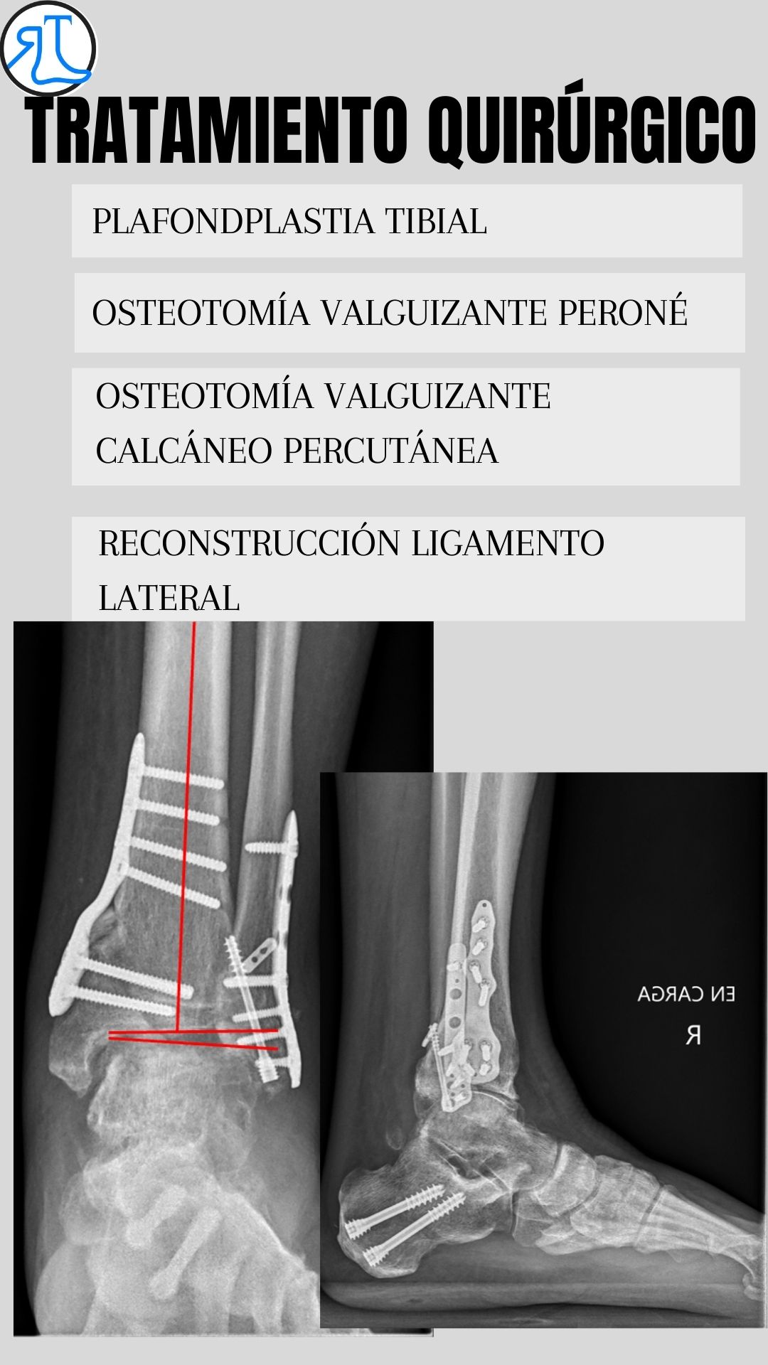 Dada su edad y la existencia de una artrosdesis en el tobillo contralateral decidimos una cirugía de preservación articular mediante plafondplastia de apertura medial. Se asoció osteotomía valguizante de peroné, osteotomía calcánea percutánea valguizante y reconstrucción de ligamento lateral del tobillo mediante aloinjerto como recomiendan las últimas publicaciones en la literatura en casos similares.