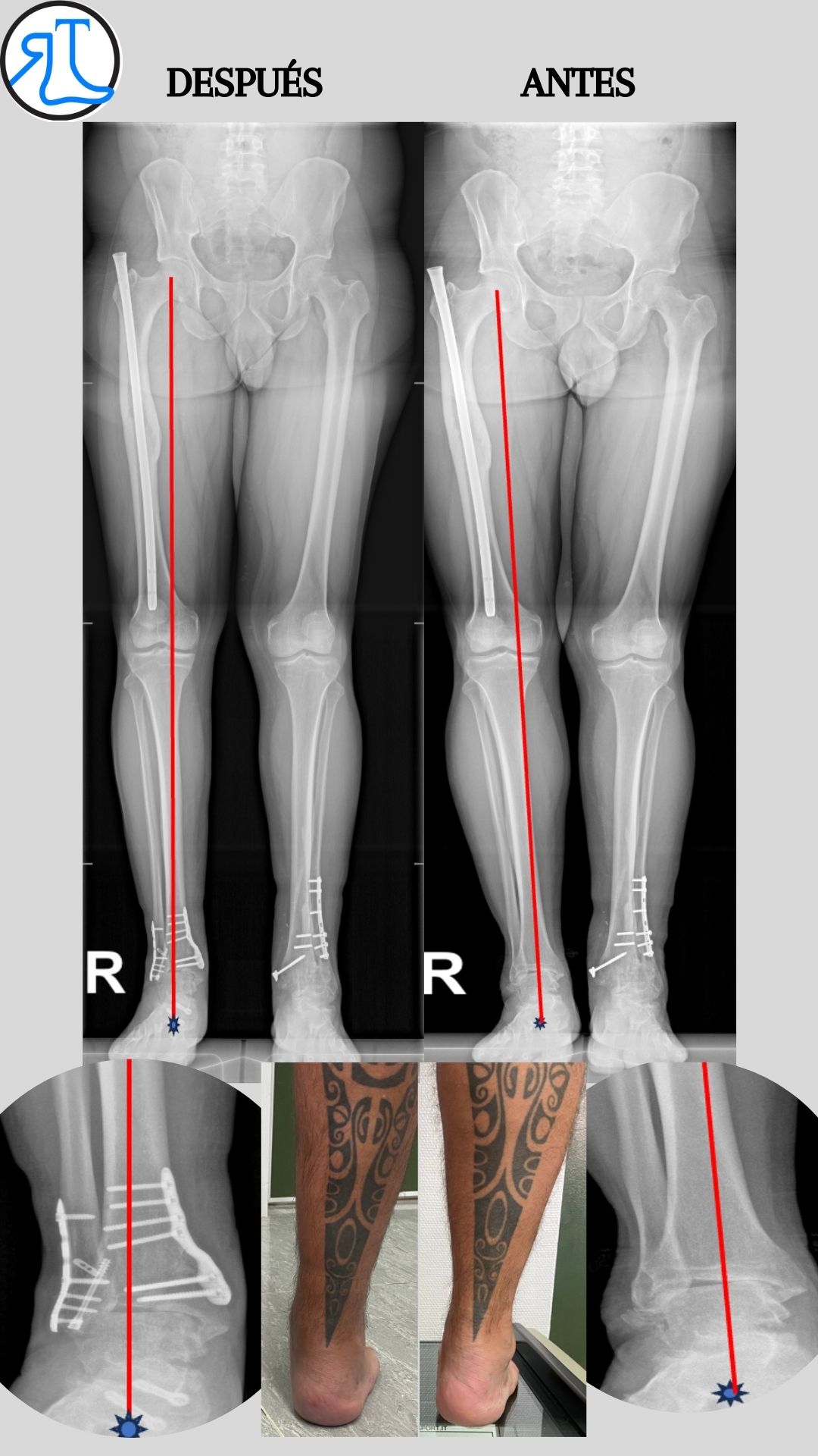 Como podéis ver en las imágenes se consiguió mejorar el eje del talón trasladando el eje de carga de al extremidad hacia la zona del tobillo más sana. A pesar de no corregir del todo el tilt talar el paciente se encuentra asintomático.