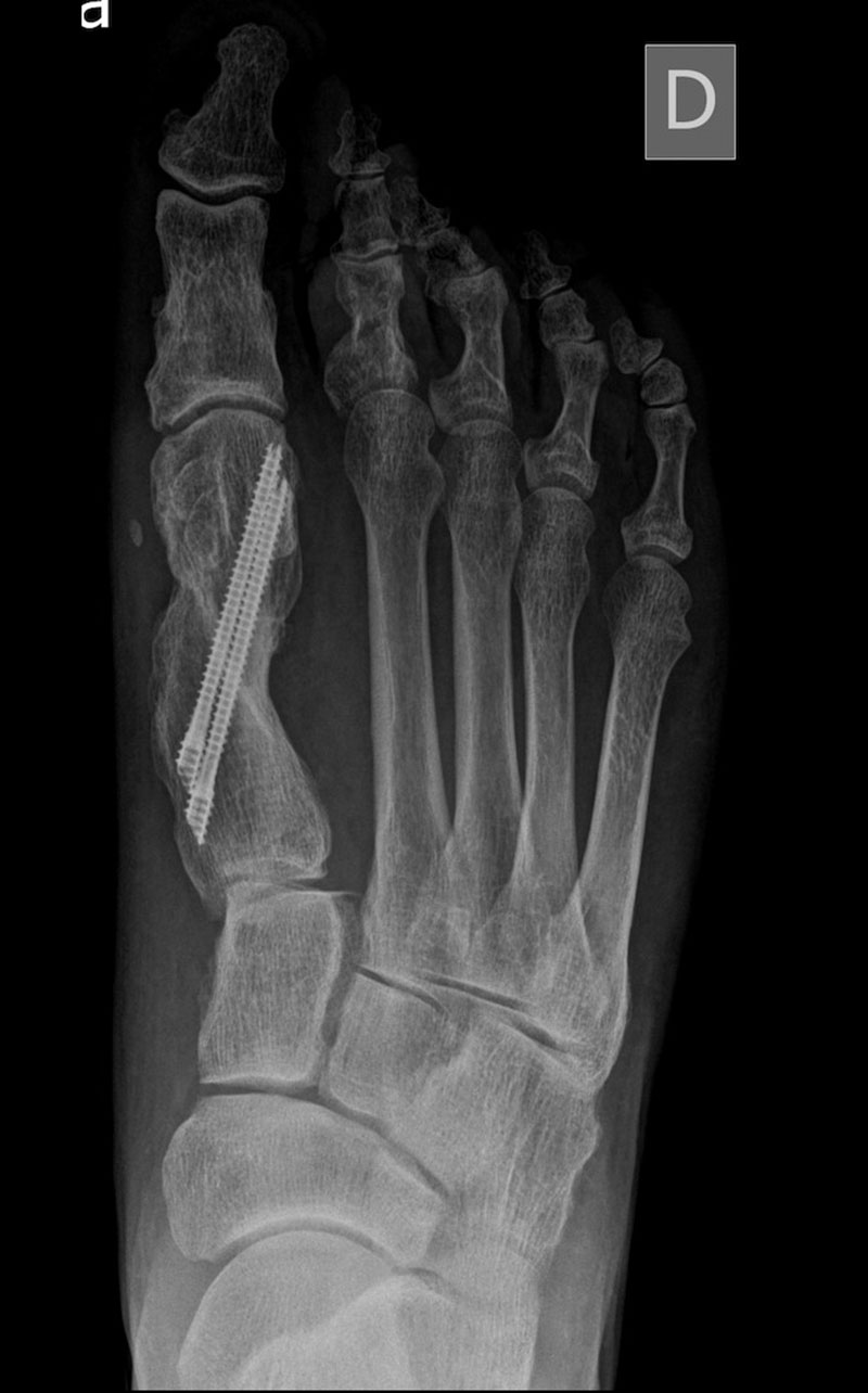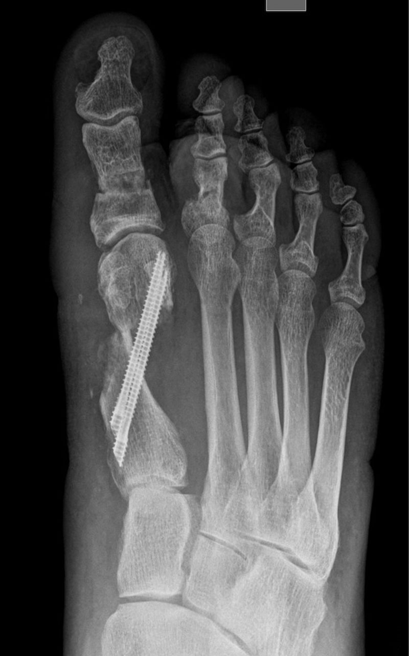 En las imágenes radiográficas se observa cómo se consigue una gran corrección en la posición de los dedos y una reducción de los sesamoideos sobre la cabeza metatarsiana. La fijación con tornillos nos va a permitir mantener esa reducción y estabilizar el montaje para reducir el dolor postoperatorio y permitir una buena consolidación ósea, como se ve en la última imagen.