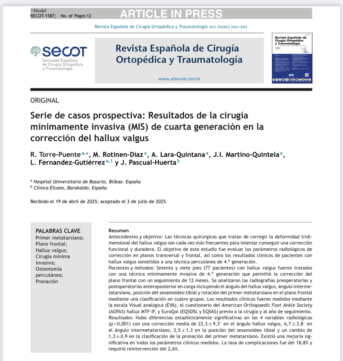 El último trabajo aparece en la revista española de Cirugía Ortopédica y Traumatología SECOT, una de las referentes en el campo de la cirugía de pie y tobillo en España.