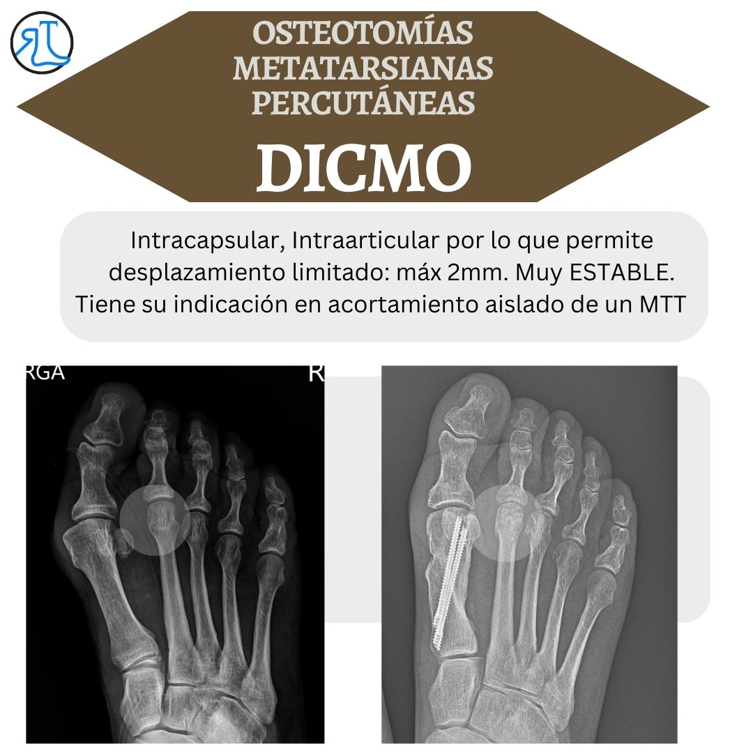 • La osteotomía DICMO (Minimally Invasive IntraCapsular Osteotomy) es una variante de la DMMO pero más distal , a nivel intracapsular, por lo que va a permitir un menor acortamiento. Esto hace que la relación de longitud del metatarsiano tratado respecto a los demás no se altere tanto y no se necesite acortar otros metatarsianos, lo que disminuye la agresión del tratamiento. Por contra, sólo se indicará cuando el acortamiento necesario sea de menos de 2mm.
